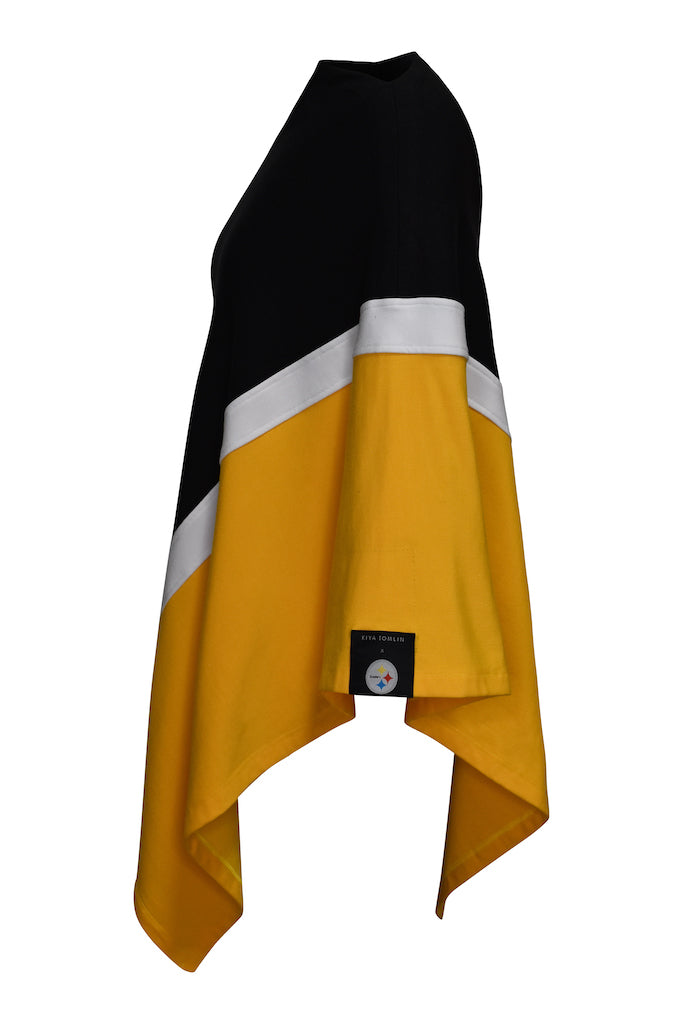 This Pittsburgh Steelers tri-color poncho is perfect for wearing as an extra layer for warmth while making a fashion statement about your favorite NFL team. You will feel as if you are wrapped up in a cozy blanket. The sewn on, full color Pittsburgh Steelers team logo patch is positioned at the side arm.