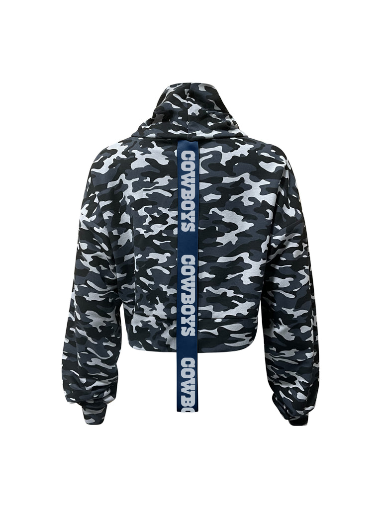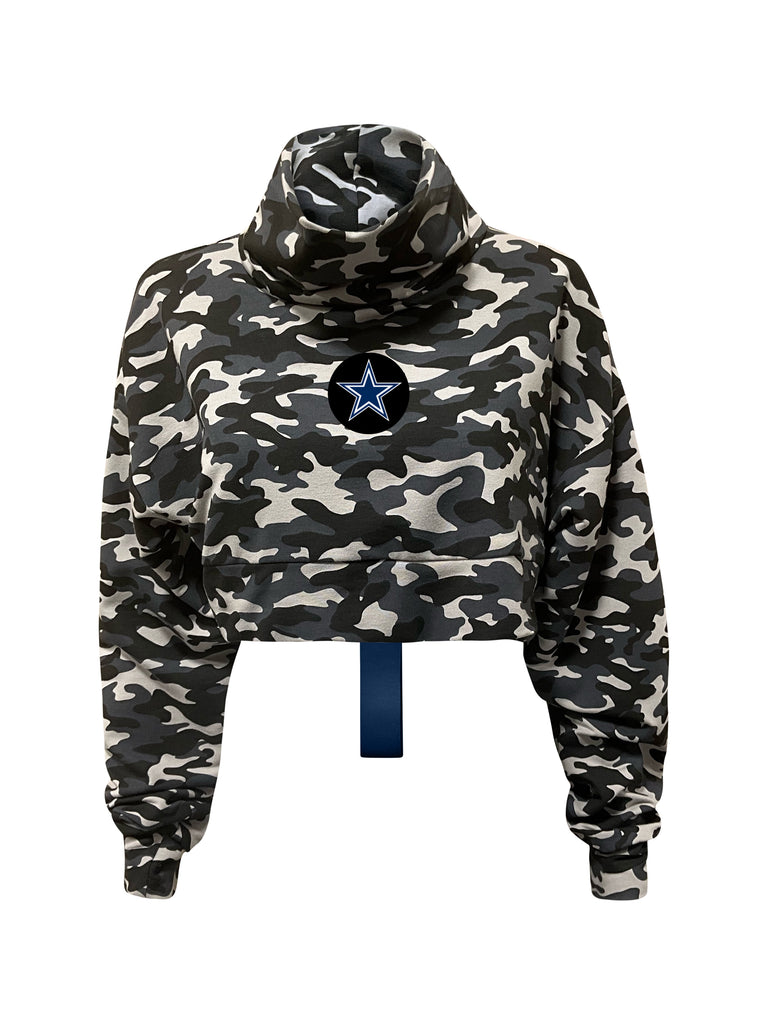 Turn heads with our Women's Cropped Camo Sweatshirt. The chic turtleneck, camo print, and NFL team logo create a bold style statement. Made from a soft bamboo blend, this sweatshirt is perfect for any occasion.