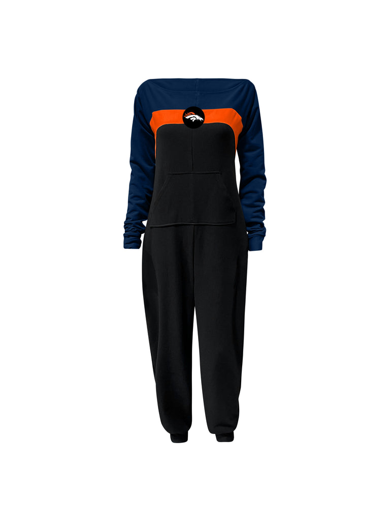 Cheer for the Broncos in style with this women’s fleece jumpsuit, featuring Denver’s iconic orange and navy colors. The wide neckline and feminine cut provide a chic fit, while the front patch pocket and rubberized Broncos logo add practicality. Stay comfortable and team-spirited in this cozy jumpsuit.