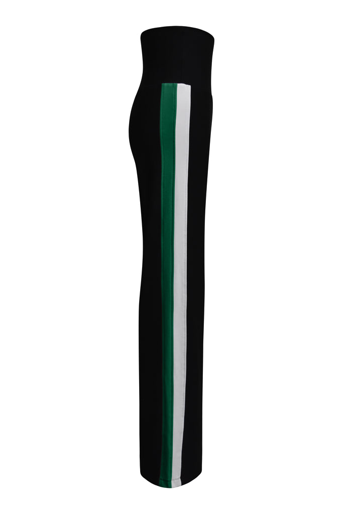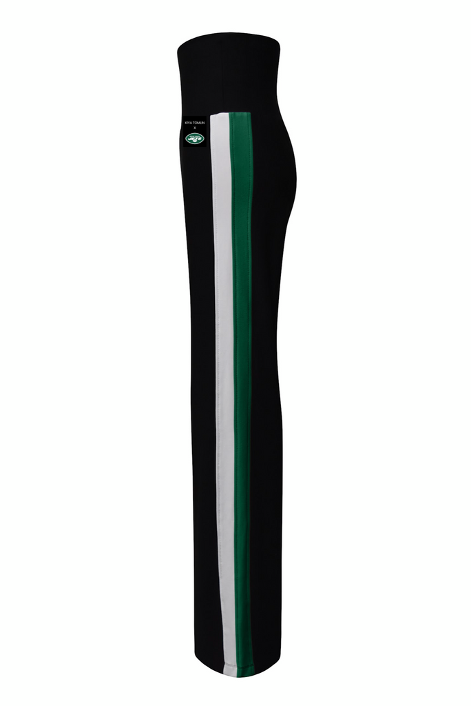 The Jets Striped Wide Leg Pant offers both style and comfort with unique design details that take this style beyond your typical game day sweatpants . These sporty pants feature our signature waistband that can be worn high-waisted or folded over like a yoga pant and elongating team colored stripes down the sides. The sewn-on, full color New York Jets team logo patch is positioned at the side hip.