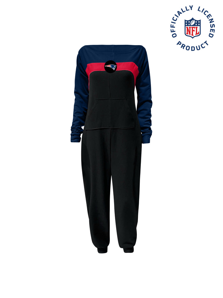 Get comfy in Patriots pride with this fleece jumpsuit! Featuring red, white, and blue team color blocking, a wide neckline, and a flattering feminine cut, this jumpsuit is both stylish and cozy. The front patch pocket and rubberized Patriots logo complete the look for a game day or lounging essential.