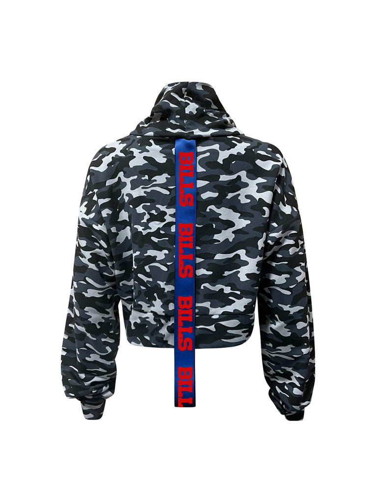 Elevate your game day attire with our Women's Cropped Camo Sweatshirt. Featuring a high turtleneck and camo design, this piece is perfect for the stylish fan. The bamboo fabric blend ensures comfort, while the NFL logo proudly displays your allegiance.