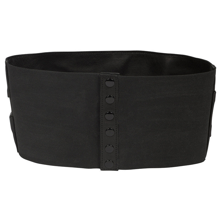 This pleated leather front belt is 6" wide, with an elastic back and 6-snap closure.