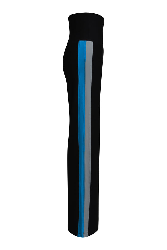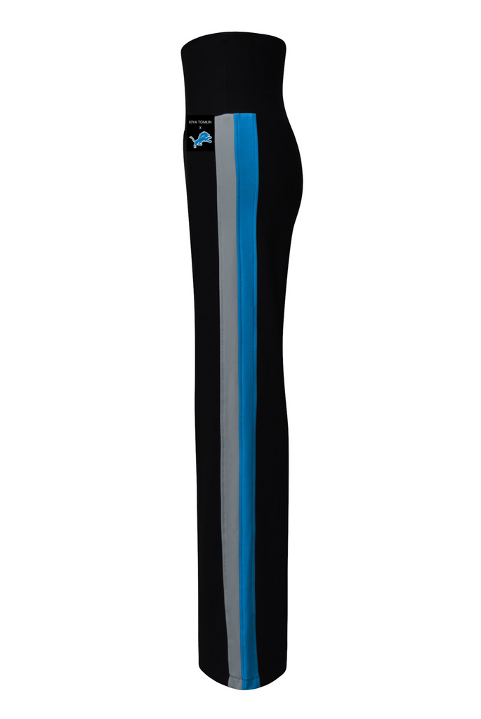 The Lions Striped Wide Leg Pant offers both style and comfort with unique design details that take this style beyond your typical game day sweatpants . These sporty pants feature our signature waistband that can be worn high-waisted or folded over like a yoga pant and elongating team colored stripes down the sides. The sewn-on, full color Detroit Lions team logo patch is positioned at the side hip.