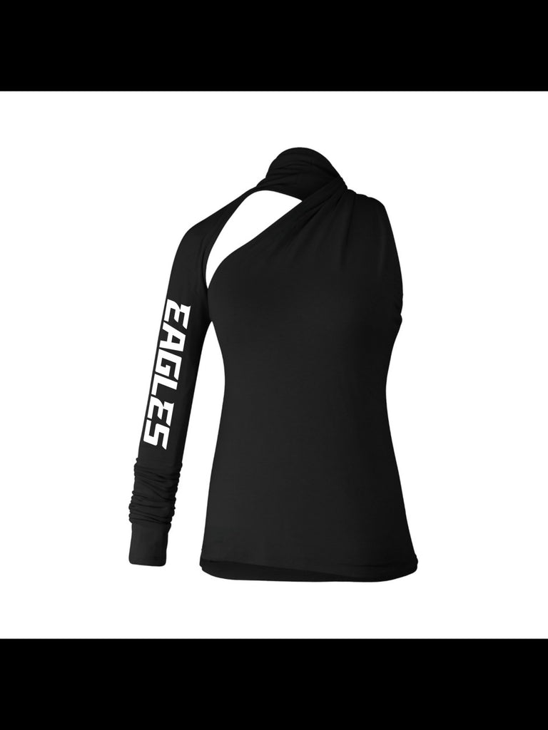 Fly your Eagles colors with this one-shoulder Sling Tee. Made from bamboo fabric, it’s both comfortable and stylish. The straight fit and ruched sleeve offer a sophisticated touch, while the unique neckline grabs attention. Wear it with tailored pants for a chic look or keep it casual.