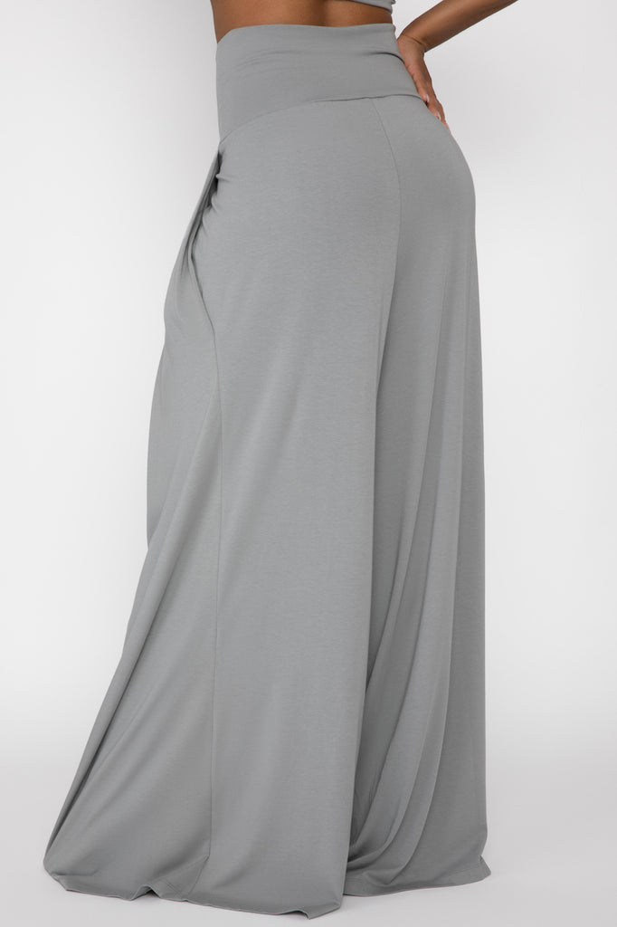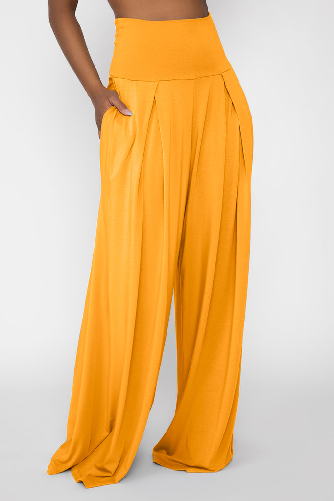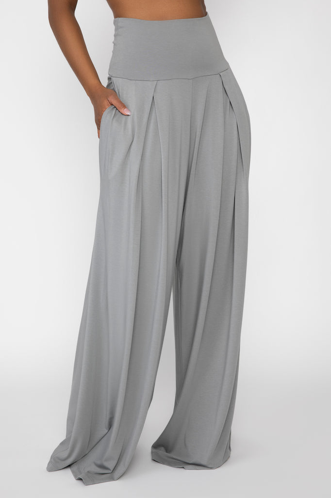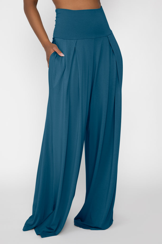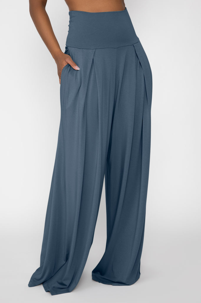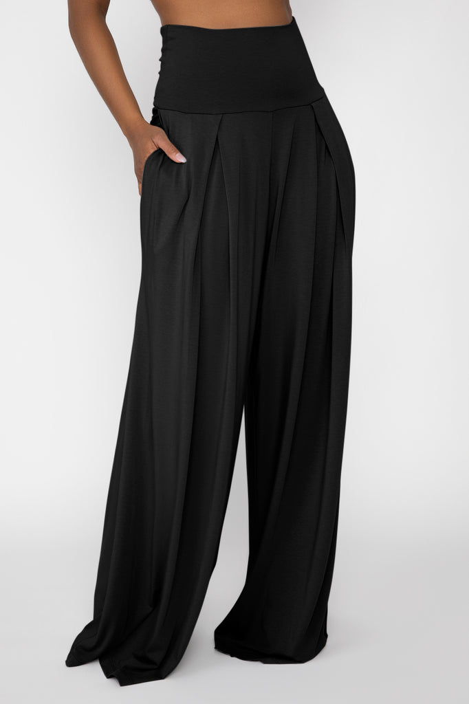 The most comfortable and glamorous bottoms ever! Complete with pockets and a yoga-style fold-over waistband, these high-waisted wide-leg stretch pants easily transition from day to evening. The drape is elegant and forgiving, creating a flowy sophistication whether you are walking or standing still.