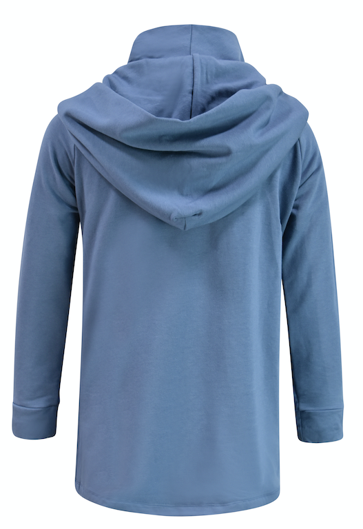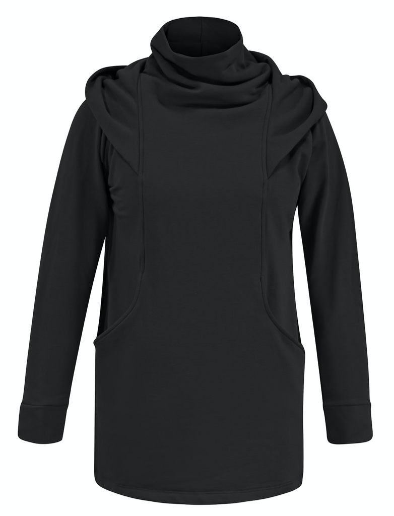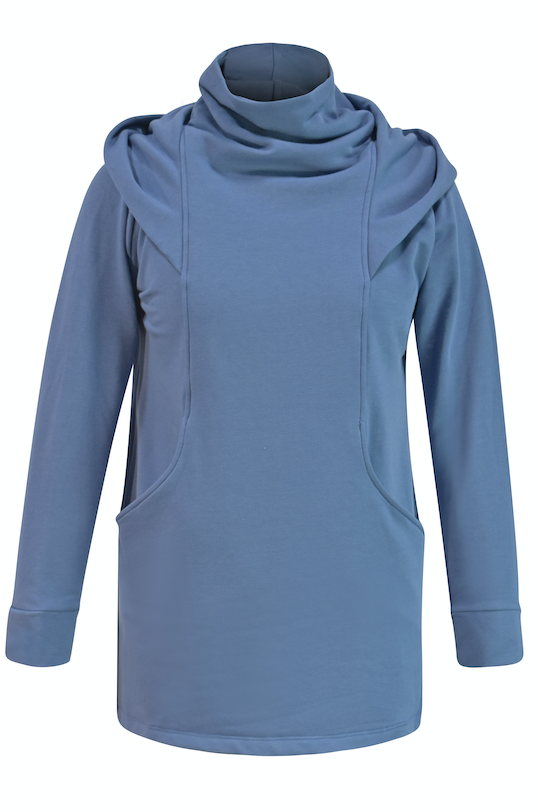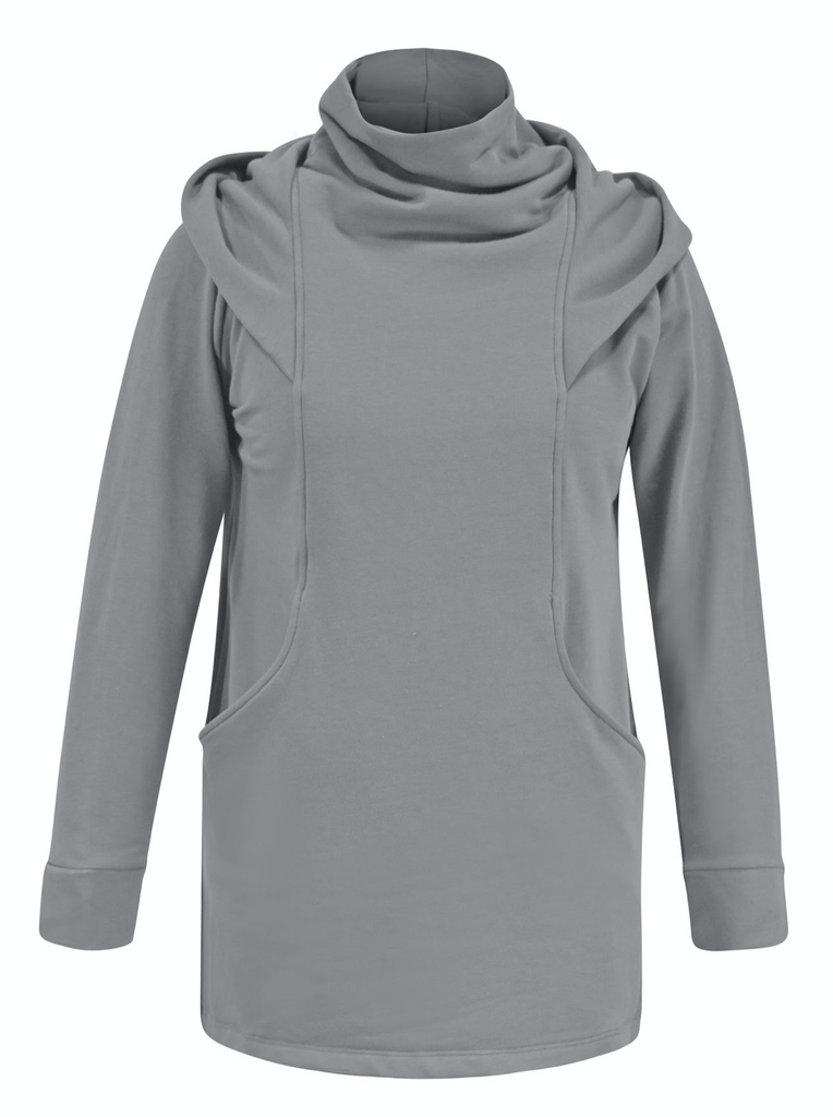 The elevated mock neck hooded sweatshirt with front paneling has a flattering affect that you could never have in a traditional kangaroo pouch hoodie. The hi-low style with the back curved hem allows you to wear with leggings in comfort knowing you are covered in all the right places.